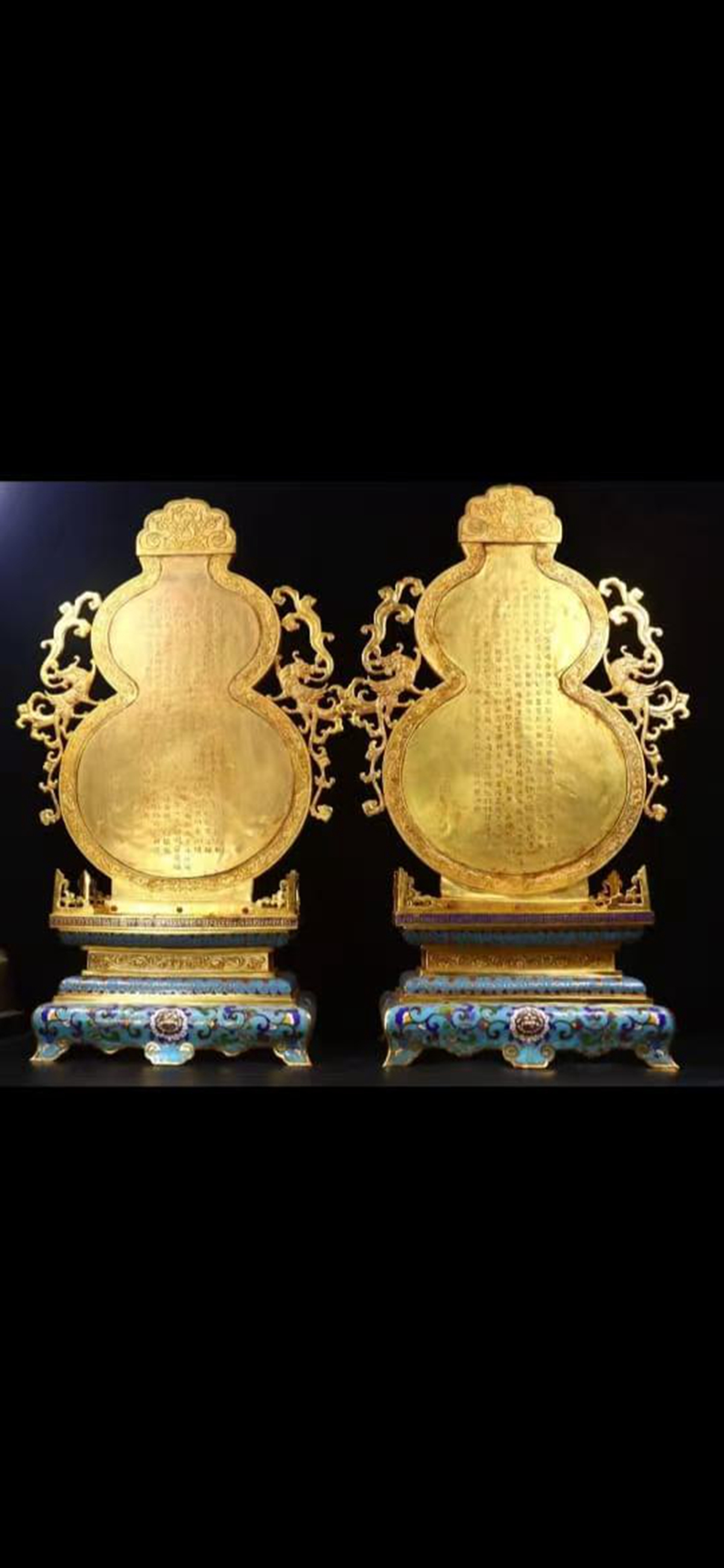 清乾隆铜胎拍丝珐琅嵌百宝大吉葫芦插屏一对